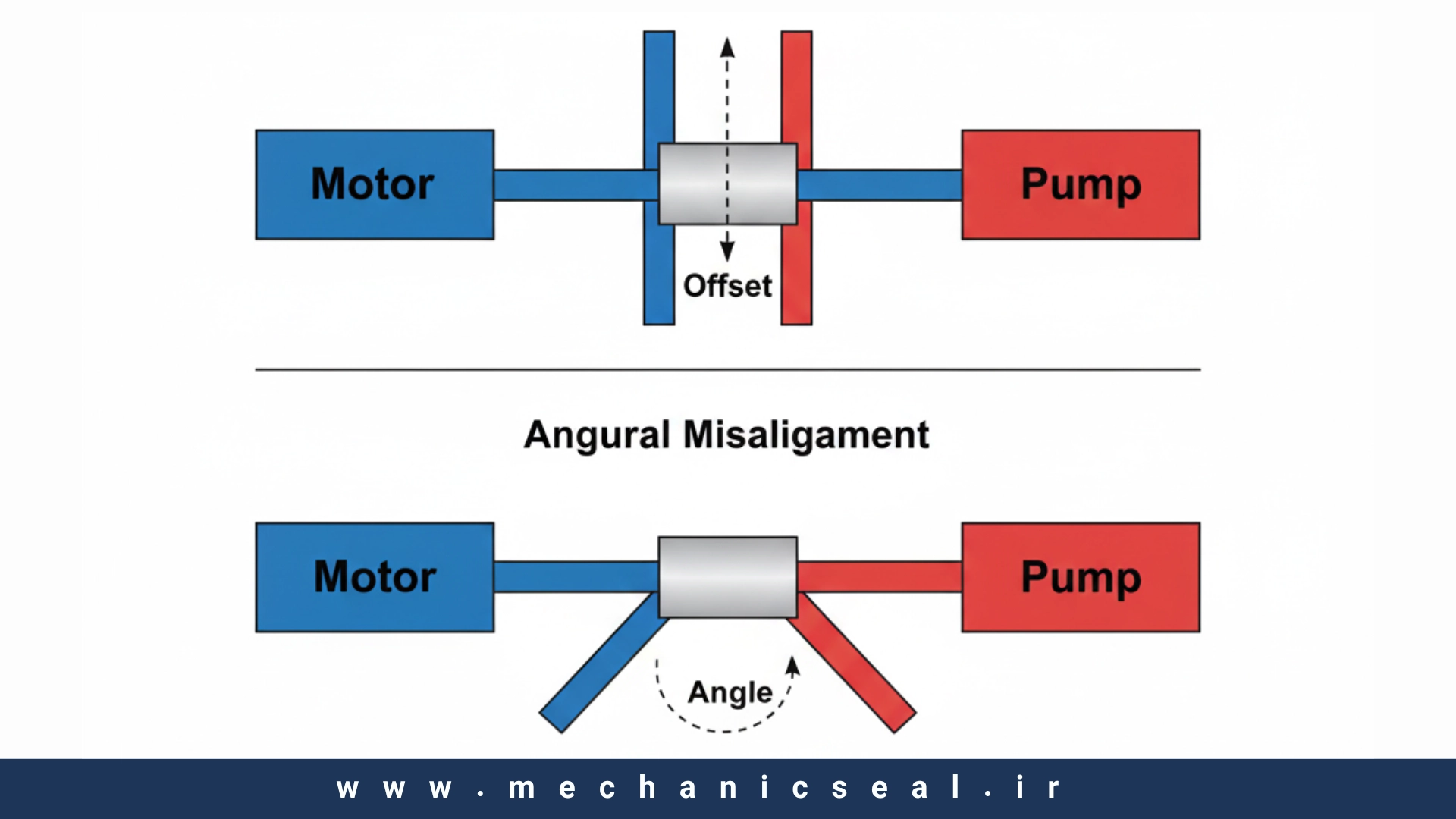 مکانیکال سیل برای آببندی یک شفت که **عمود** بر بدنه میچرخد طراحی شده است، نه شفتی که در حال “لرزیدن” یا “لنگ زدن” است. **عدم تراز بودن پمپ (Misalignment)**، چه به صورت زاویهای (Angular) و چه به صورت موازی (Parallel) بین موتور و پمپ، ارتعاشات شدیدی ایجاد میکند.